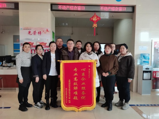 “非常感谢中心工作人员对我们企业的大力支持,感谢你们的热情服务,这么短的时间就帮助我们办理完成房屋的预告登记。”近日,喜桂图投资置业有限责任公司将一面印有“心系企业服务优 专业高效解难题”的锦旗送到石拐区不动产登记中心工作人员手中,感谢中心工作人员为他们提供了优质、便捷、高效、热情的服务。